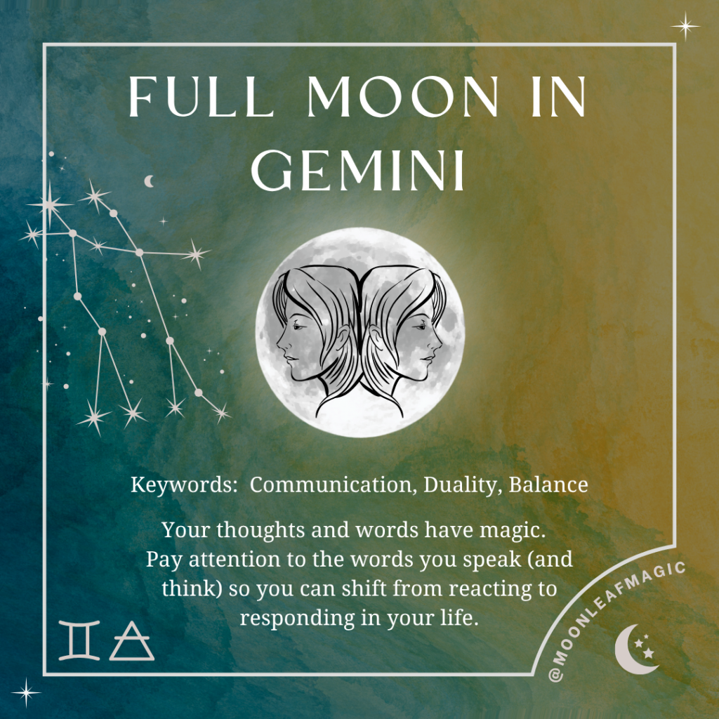 The Full Moon in Gemini is a good time to communicate with yourself, and your subconscious. Be sure to journal on the questions I asked earlier in this article.